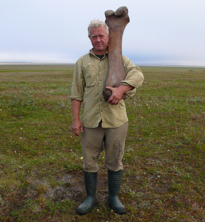 Автор публикации Владимир Горбатовский с костью мамонта на острове Самойлов