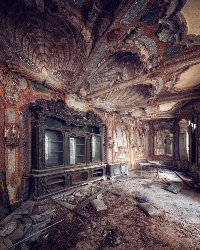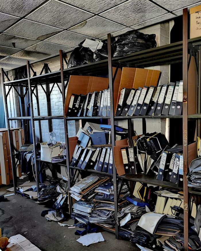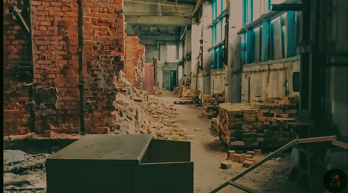 Внутри здания вывернуты вверх дном, будто кто то огромный, когтистой рукой, за один мах, выдрал всю проводку, ценные трубы, за одно спилив лестницы на вторые и третьи этажи. Это очень забавно.