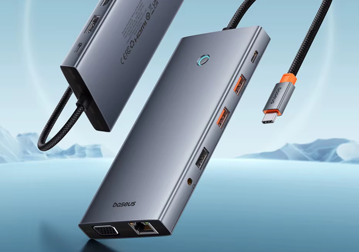 USB-C хаб Baseus превращает один порт Type-C в целую станцию подключений. Устройство оснащено двумя HDMI-разъёмами с поддержкой 4K, портом VGA, двумя USB 2.0 и одним скоростным USB 3.0, а также Type-C с функцией Power Delivery мощностью до 100 Вт. Такое сочетание делает возможным одновременно подключать монитор, клавиатуру, флешку и зарядку ноутбука.