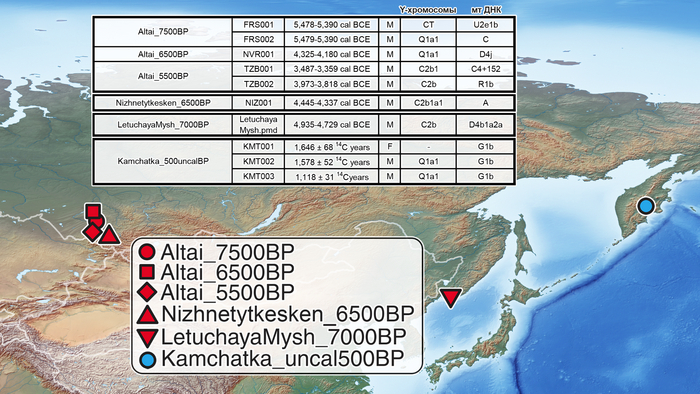 В данной работе авторы получили полногеномные данные шести охотников-собирателей из четырех археологических памятников Саяно-Алтая, охватывающих период от 7,5 до 5,5 тыс. лет назад, а также охотника-собирателя из пещеры Летучая Мышь на Дальнем Востоке России, к северо-западу от Находки, возрастом 7 тыс. лет и трех менее древних обитателей Камчатки с некалиброванными датами, которые помещают их в интервал между XII и XVII веками нашей эры, точнее определить не позволяет эффект морского резервуара.