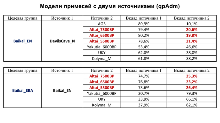 В результате было обнаружено, что все три алтайские группы подходят для моделирования прибайкальских охотников-собирателей раннего неолита (EN) и раннего бронзового века (EBA) в моделях примесей с двумя источниками (qpAdm).