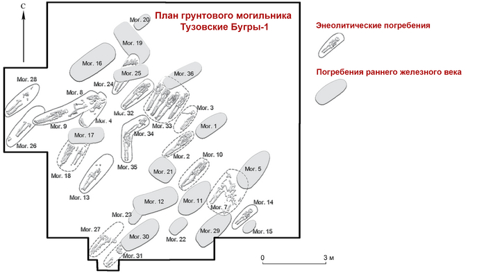 После обнаружения в 1995 году трёх могил, в 2000 году на памятнике Тузовские Бугры-I уже было исследовано 37 погребений. Из них 19 относятся к эпохе энеолита – ранней бронзы, остальные к раннему железному веку. Часть погребений раннего комплекса была нарушена более поздним. Энеолитические могилы располагались четырьмя рядами, глубиной 0,5–1,15 м, ориентированными по линии СЗ–ЮВ.