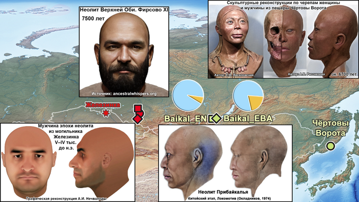 Для моделирования прибайкальских охотников-собирателей раннего неолита (EN) в дополнение к родословной древних северо-восточных азиатов (ANA), как у представителей неолита из пещеры Чёртовы Ворота в Приморье, требуется около 20% родословной охотников-собирателей Алтая. А для моделирования охотников-собирателей раннего бронзового века (EBA), в дополнение к родословной охотников-собирателей раннего неолита дополнительно требуется около 25% родословной алтайских охотников и собирателей. При этом даты примеси родословной охотников-собирателей Алтая для байкальского неолита и бронзового века близки и составляют 8296 ± 624 лет назад и 8202 ± 995 лет назад соответственно.