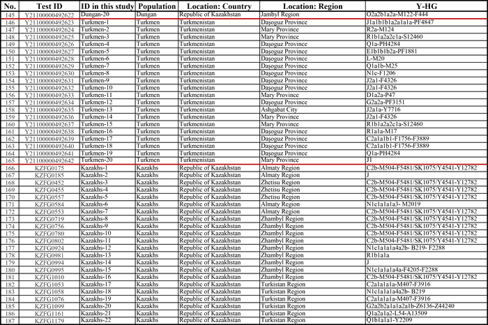 Гаплогруппа C2a1a1b1-F1756 была преобладающей отцовской линией древних племен дунху и сяньби, а появление этой линии у хазарейцев, кыргызов и туркмен указывает на то, что их предки по отцовской линии из Восточной Евразии. Гаплогруппа C2a1a2a-M48-F6379 имела высокую частоту в Младшем жузе казахов и ойратов — западных монголоязычных народов. Появление этой линии у каракалпаков свидетельствовало о близком родстве этого населения с казахами и древними монголами. Считается, что экспансия в Центральной Евразии С2а1а3- M504 напрямую связана с деятельностью древних монгольских племен в прошлом тысячелетии. В исследовании отмечена высокая частота этой линии в популяциях хазарейцев, каракалпаков, казахов, кыргызов и уйгуров, что согласуется с предполагаемым монгольским происхождением этих популяций из предыдущих исследований разных авторов. Линии N-M231 у казахов связаны с древнетюркскими племенами. А линии D-M174 и O-M175, обнаруженные в популяциях Центральной Азии, появились в результате смешения за последние 2000 лет с популяциями из Восточной Азии.