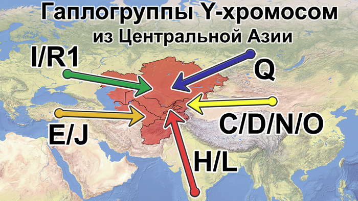 Основные отцовские гаплогруппы популяций в разных регионах Евразии включают C-M217, D-M174, E-M96, G-M201, H-L901, I-M170, J-M304, L-L298, T-M184, N-M231, O-M175, Q-M242, и R-M207. Эти макрогаплогруппы распространены и в популяциях Центральной Азии, однако их частоты существенно различаются. На уровне сублиний население Центральной Азии имеет определенные доминирующие линии.