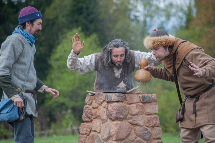 Отдельно стоял исторический лагерь, в котором расположились реконструкторы. Это главные участники фестиваля. На небольшом участке они полностью воссоздали быт тысячелетней давности. Отдельно был туристический лагерь.