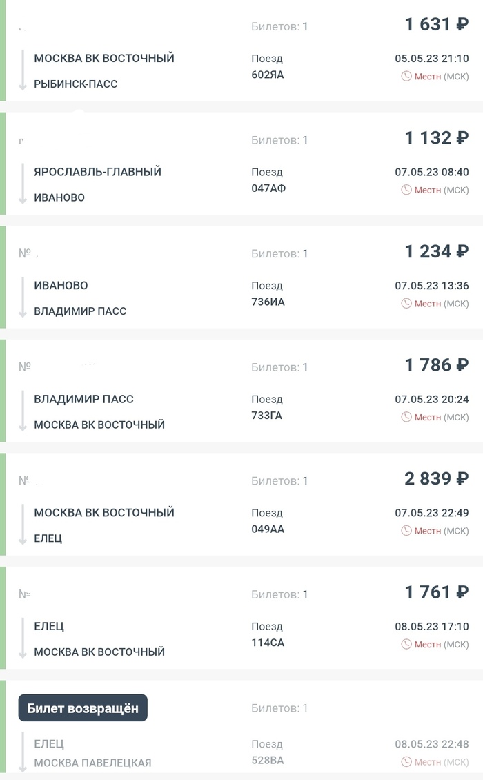 сел на ночной поезд в пятницу 5 мая, вернулся ночным за полночь 9 мая.