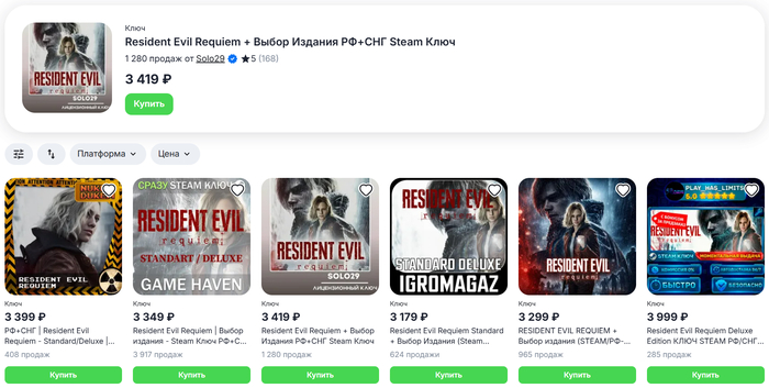 Переходим в категорию «Resident Evil Requiem» и выбираем подходящий товар. Также, как и в предыдущем способе, смотрим на его критерии, внимательно читаем описание и оплачиваем.