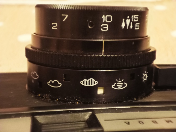 - Для упрощения выбора экспозиции каждое значение выдержки обозначено символом погоды, а каждое значение диафрагмы — значением светочувствительности фотоплёнки. Таким образом, не имея ни экспонометра, ни опыта, можно установить сочетание выдержки и диафрагмы, примерно соответствующие условиям освещённости (хотя и не оптимальные в других отношениях).