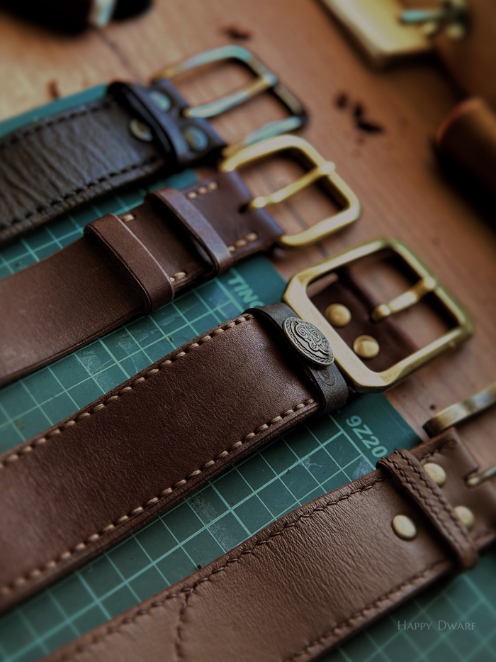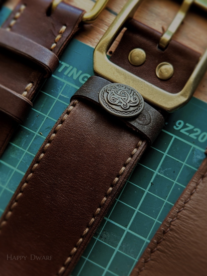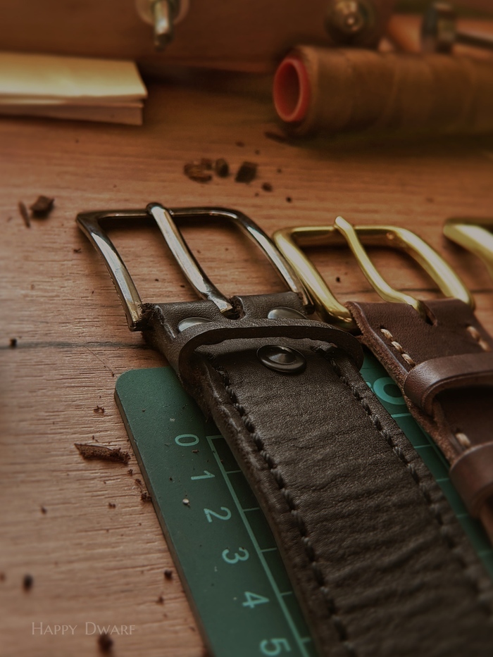 В работе ременная кожа 4.5 мм, комбинированное дубление. Фурнитура латунь с PVD-покрытием от Buckleguys.