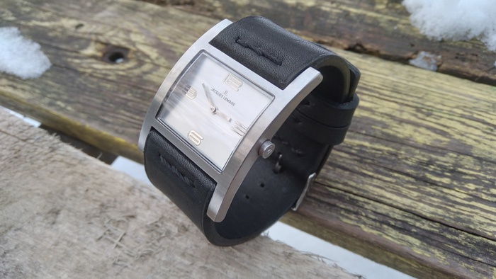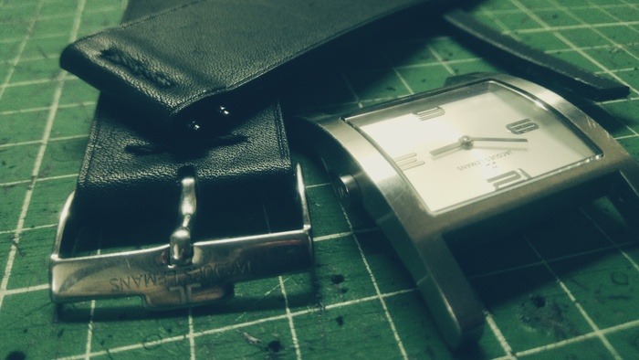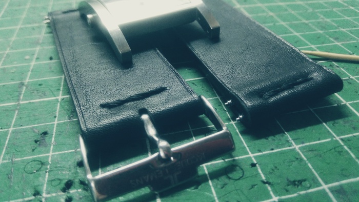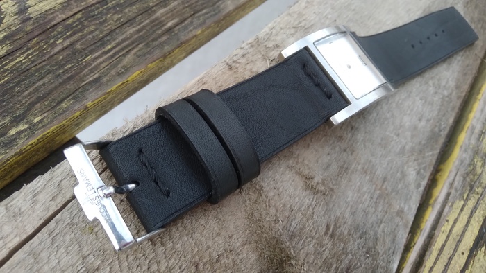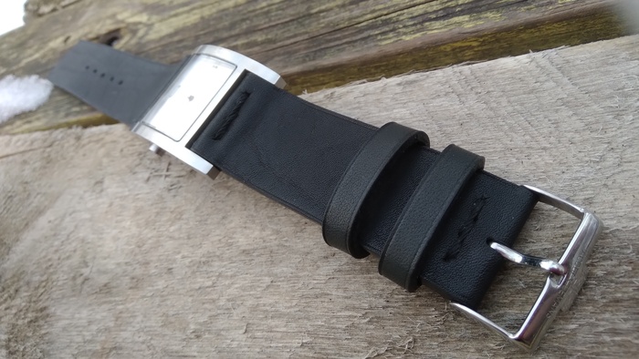Родной ремешок был изношен в хлам и даже при помощи то-ли лески, то-ли тонкой проволоки, сшит где отверстия фиксации пряжки...