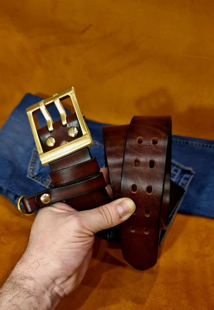 Далее: долговечность. Ремень должен добротно выглядеть через год и семь лет. Поэтому никаких лаков и эмалей снаружи: только масло и воск. Такой с годами темнеет по краям, приобретает налет времени и шарм от прикосновения ваших рук.