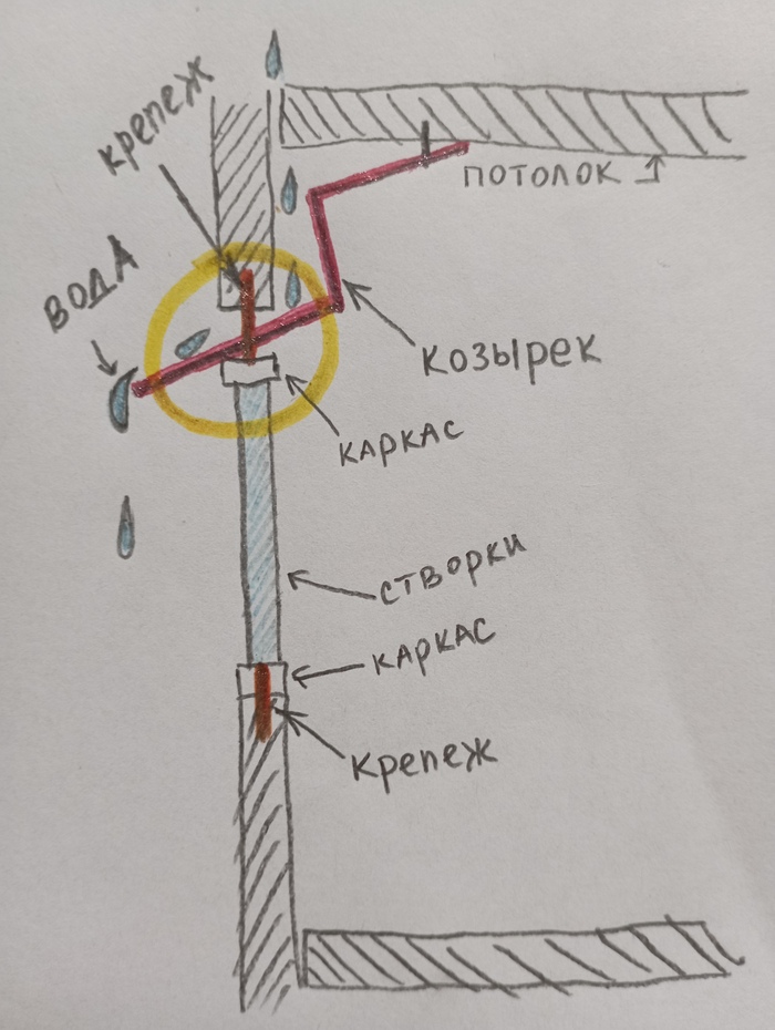 Но крепиться в этом случае каркас остекления будет к верхней плите на штыри. На этих же штырях будет и козырёк. Но он будет, получается, не притянут никак и во время ветра/дождя будет греметь? (На рисунке это место обвела жёлтым цветом).