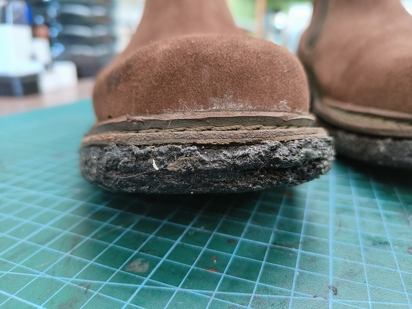 На одном из моих рабочих столов отличная пара замшевых челси. И вот на них необходимо заменить подошву на что то другое. Мы уже писали о подобной работе, только там были ботинки типа "дизерты" со светлой креповой подошвой, тоже пришедшей в жалкое и печальное состояние.