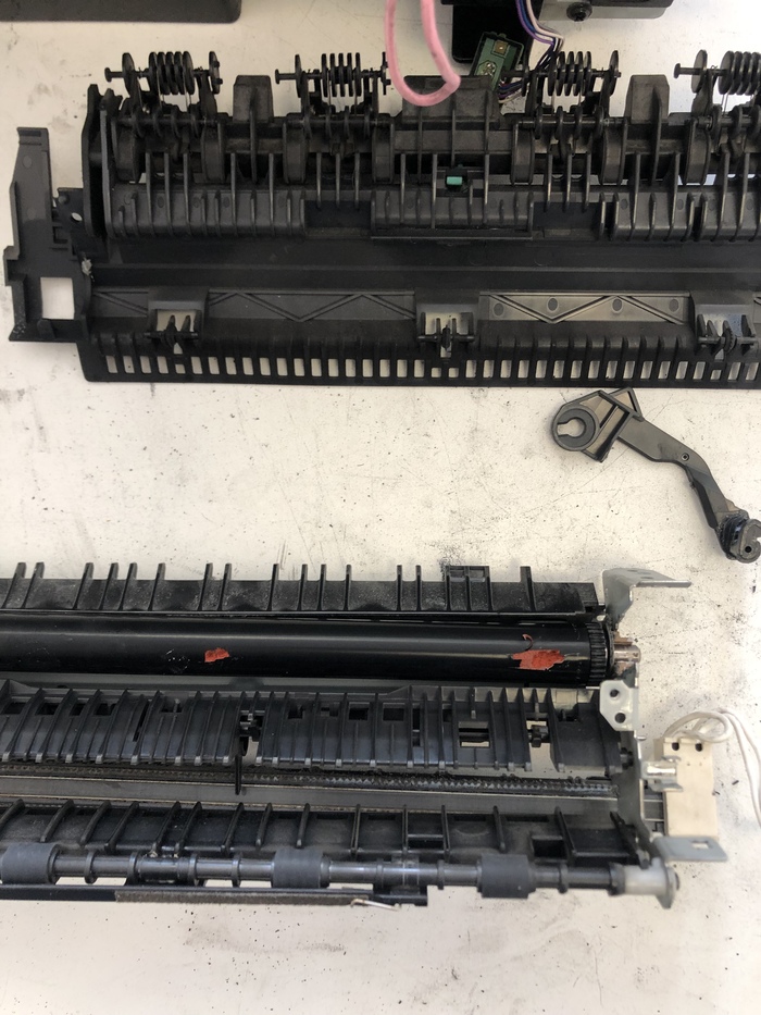 Ось теперь прямая, поэтому дальше все по чек-листу, а именно полный разбор и ТО с ревизией всего и вся. Как видим, тут ещё и печка страданула. Меняем все сломанное и изношенное на новое и проверяем, как устройство работает. У меня все было ок, бумагу хватает, тонер на ней фиксируется, никаких нареканий к работе аппарата нет.