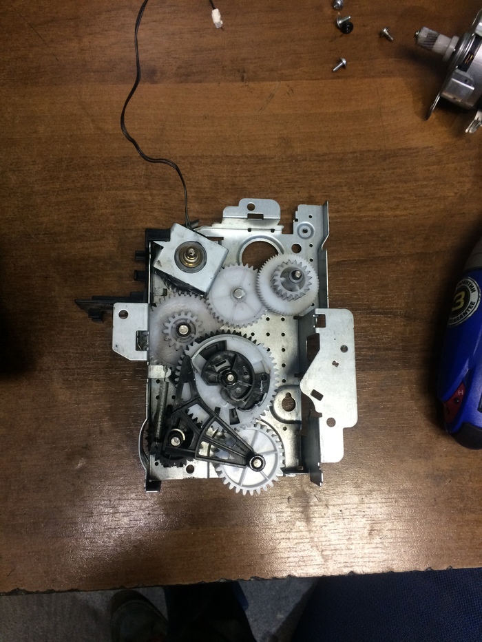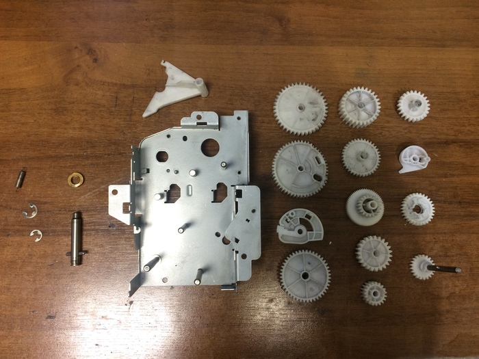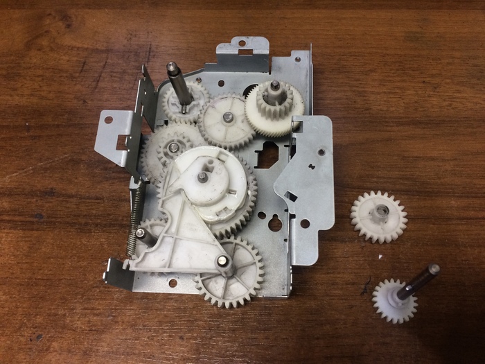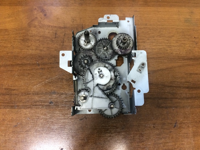 Открывается редуктор. На верхней фотке пружина снизу слева снята. Не потеряйте ее. Она предназначена для подачи бумаги. При обратной сборке я подтянул ее потуже, чтобы к этому не возвращаться.