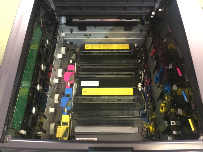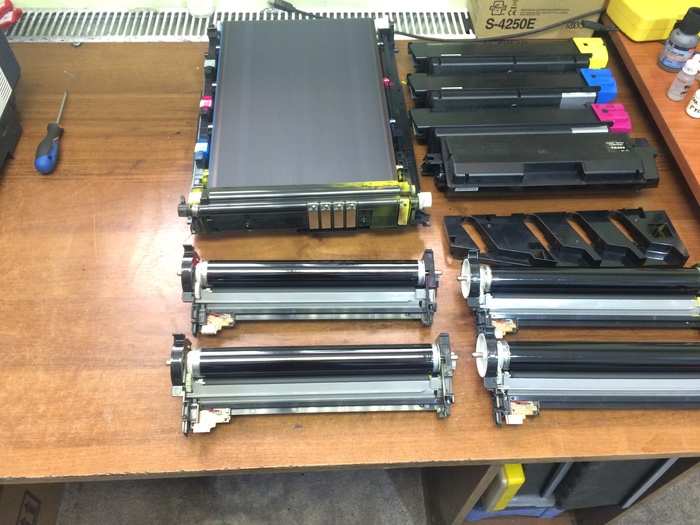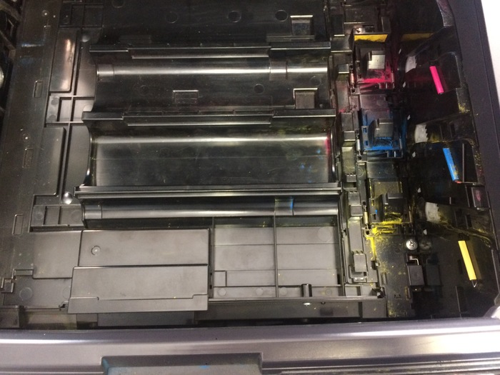 Видим блоки переноса и драмы. Синего тонера там было очень много. Вынимаем драмы.