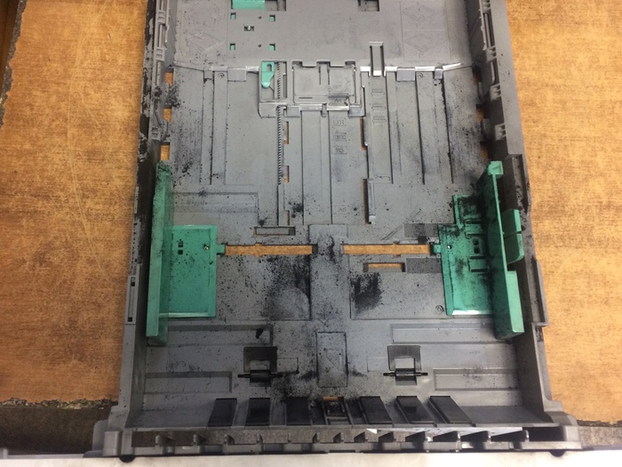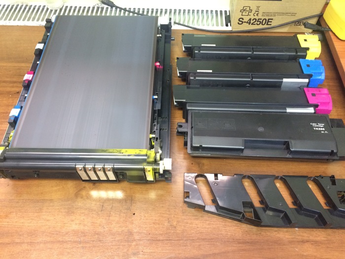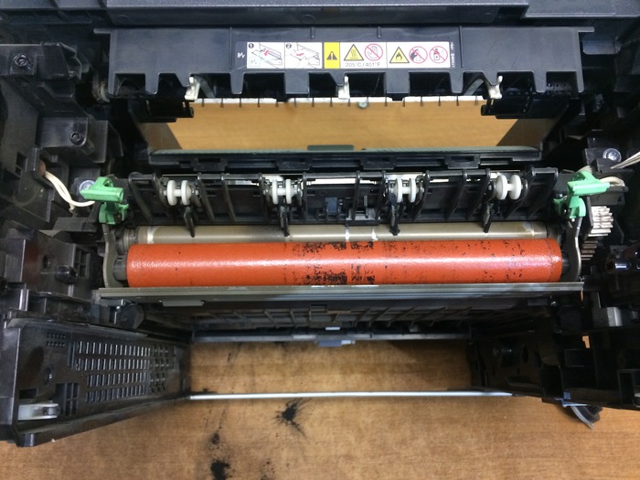 Пришёл данный аппарат с проблемой грязной печатью. Напечатав пару страниц и открыв заднюю крышку все стало понятно, что забит бункер отработки. Пробег аппарата 14100 страниц. Если вы решите самостоятельно проделать данную операцию, предупреждаю, что не имея соответствующего опыта, собрать его обратно очень сложно.
