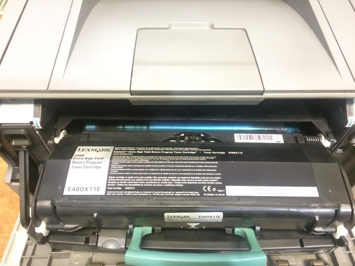 Печатаем тест, видим что фотовал устал. Открываем переднюю крышку. Извлекаем photoconductor kit с тонер-картриджем.