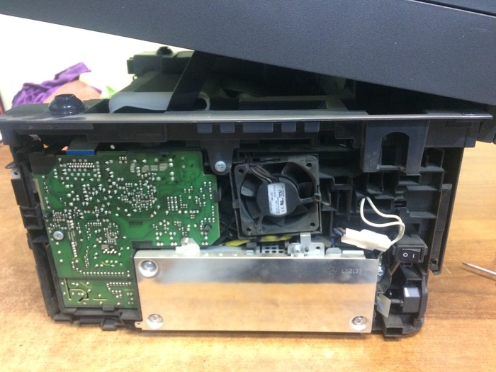 Затем снимаем форматтер-карту, правую крышку и валим принтер на бок.