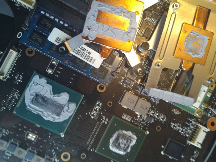 И все это окаменело... Это говоря о качестве того и как использует MSI термопасту, после MX6 температуры вернулись в норму 40 по процу в простое. Удивительно как оно вообще когда-то охлаждалось с таким нанесением термоинтерфейса.