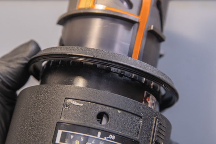 Добрался до линзы. Интересно заметить возможность юстировки положения передней линзы, в отверстия вкручиваются винты и чем сильнее закрутить тем больше отпирает линзу вперед. Таких отверстий по кругу три парных штуки, ими настраивается плоскость.