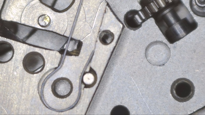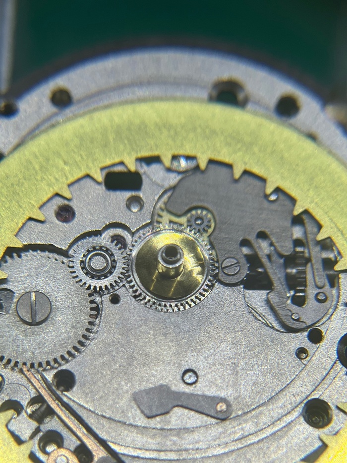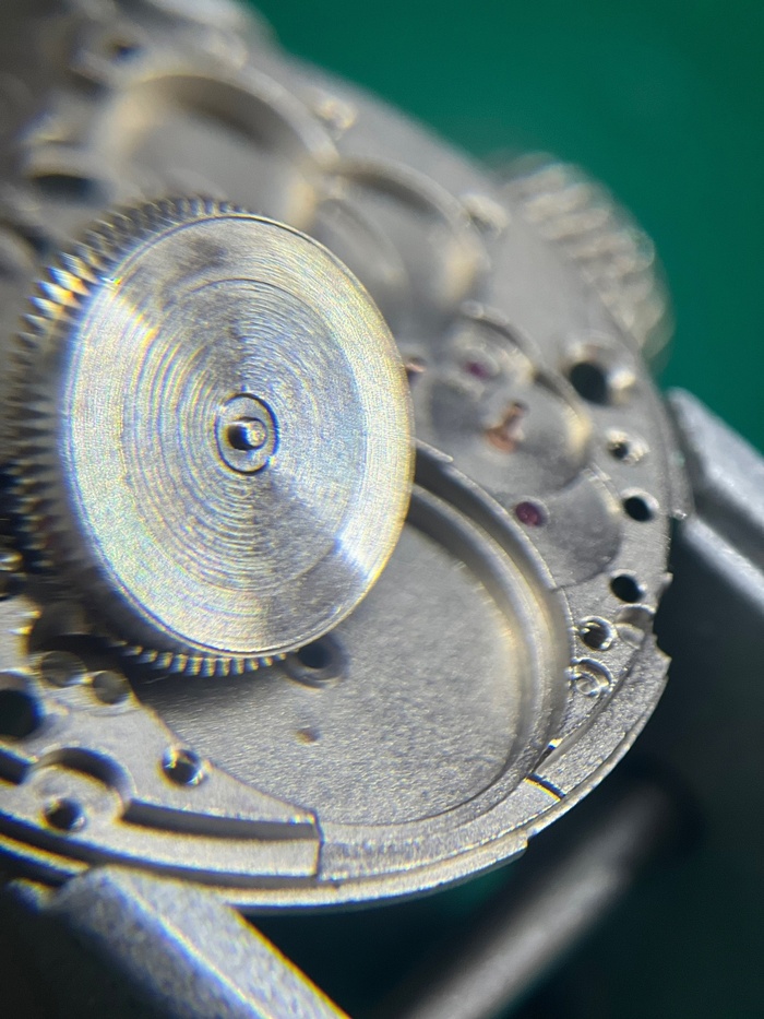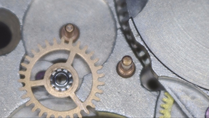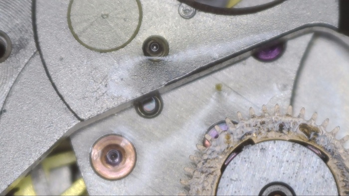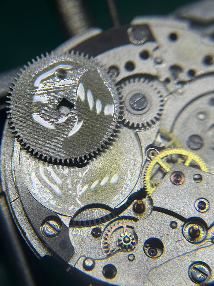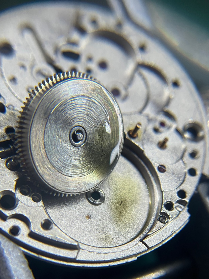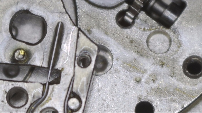 Рассмотрни загрязнения колес и мостов. И повреждение которое обнаружено было лишь в момент разбора, а именно замятое посадочное место счетчика минут (на фотографии снизу) в результате удара, который пришелся в заводную головку и переводной вал, промяв концовиком, то самое посадочное место. По колесам загрязнения зубьев, а это является показателем того, что чистка была как минимум 5+лет назад.