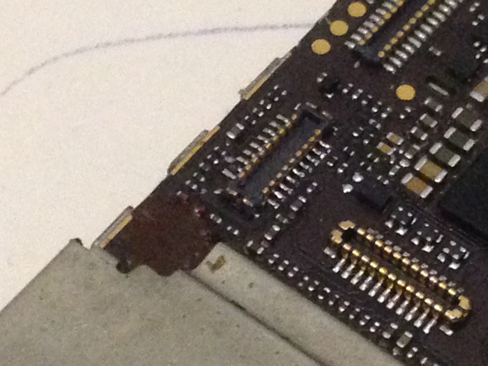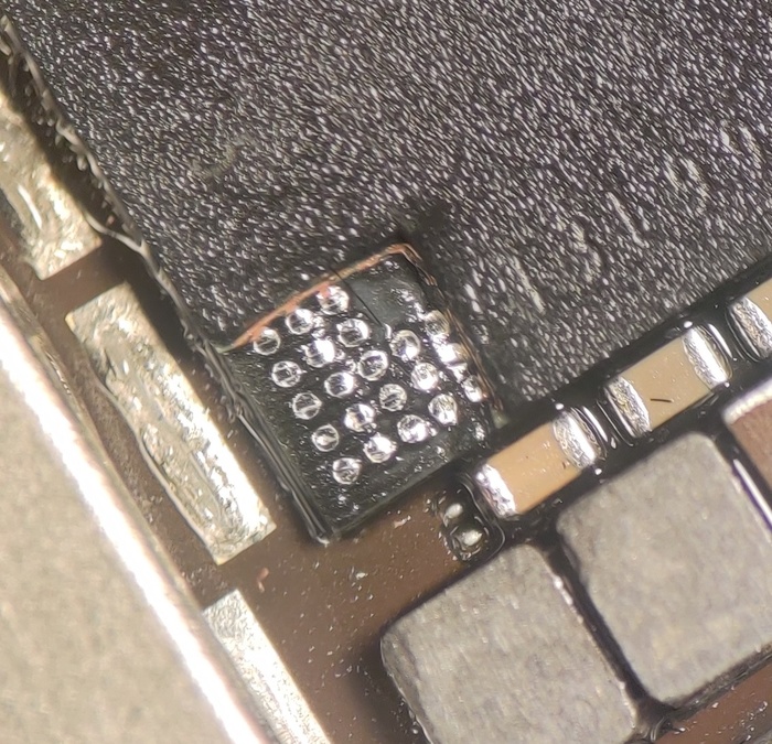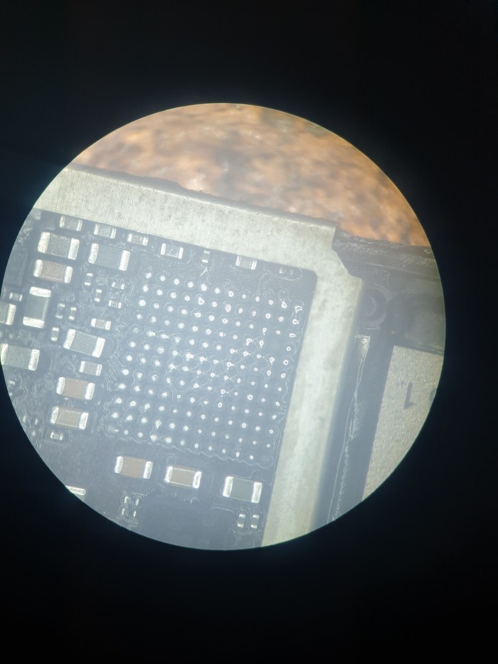 При снятии контроллера подсветки неправильно выставили температуру и оторвали микросхему с контактами, умудрились оторвать даже контакты которые идут в слои платы.