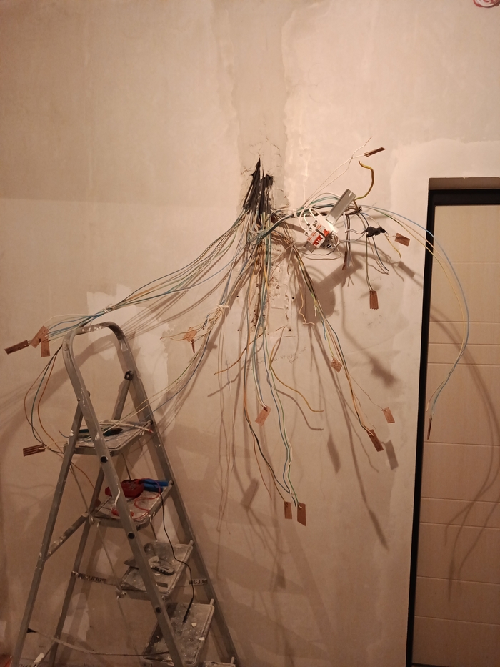 С линиями на свет было чуть сложнее: хвост у щитка зачищал и кидал нулевой провод на фазу у старого щитка. После автомата, разумеется. А дальше с индикаторной отверткой бегал к проводам, которые висят в комнатах. Может есть какие-то варианты проще и правильнее, но мне в голову пришло только это. Дальше уже начался процесс снятия изоляции и группировки проводов по кхм... группам. Подписывал всё на картонках и вешал на провода. Дико неудобно. Никогда так не делайте. Лучше уж сбегать в магазин за малярным скотчем. Только вот я уже как-то писал про лень) плюс погода совсем не способствовала желанию выходить на улицу.