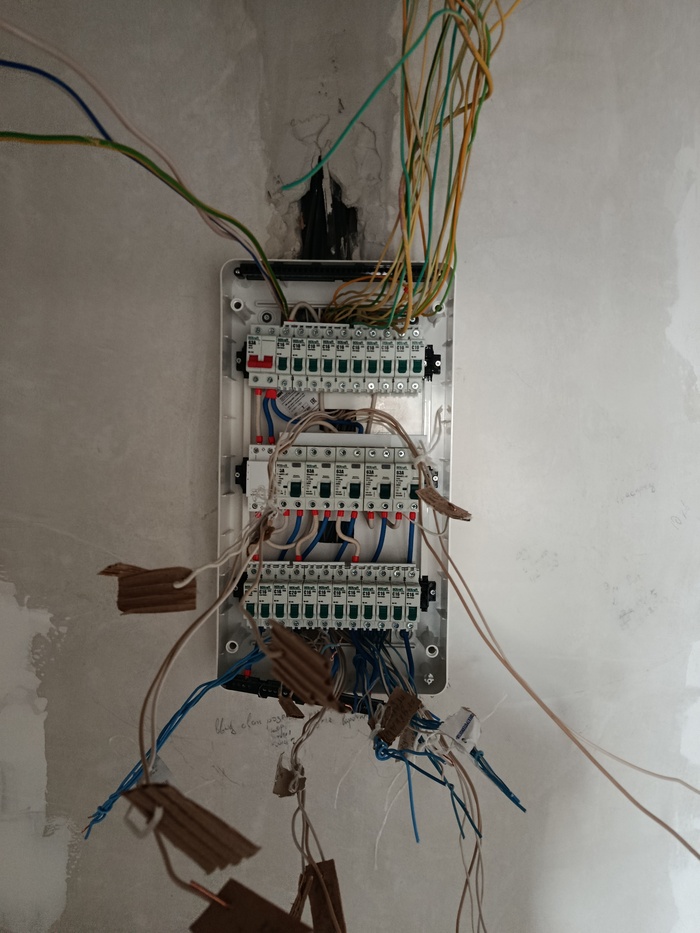 Ну а дальше было долго и нудно: снял изоляцию с нуля, подключил на шину. Снял изоляцию с фазы и на автомат. Увёл провод заземления наверх и повторяешь предыдущие пункты. Да, получилось не инстаграмбл, как говорится, но на всякий случай решил оставлять более длинные концы проводов. Очень надеюсь на то, что излишняя длина этих проводов мне никогда не пригодится, но лучше уж запас будет. Так же пришлось поменять местами первую и вторую группы, потому что провод от варочной оказался немного коротковат. Ну и добавил ещё один автомат на розетку для роутера, про которую совсем забыли. К концу второго дня получилось что-то подобное уже готовому щитку.