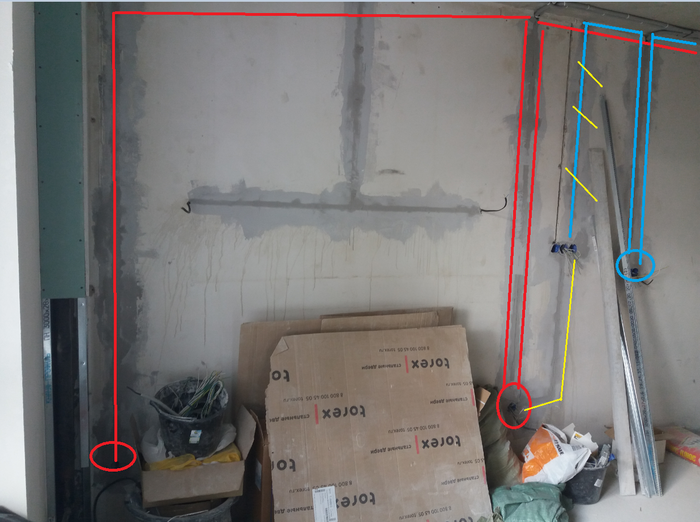 Далее позитив закончился какой-либо полностью, ибо на утро я поехал снова еще раз смотреть все внимательно и увидел, что там вообще кошмар. Трассы переделаны "по пути наименьшего сопротивления", т.е., например, сначала трасса идет в самую дальнюю точку, а потом шлейфом возвращается к более ближней к щитку. Одна из штроб заделана от потолка до середины стены (где розетка), а подсоединение к розетке другой группы переделано новой мини-штробой вниз к другой розетке таким образом в одном подрозетнике оказалось 3 кабеля вместо двух. Как собрался их соединять электрик в стандартных розетках шлейфом для меня загадка. (Внизу на фотках, красным и синим показано 2 разные группы. Самая левая группа розеток синей трассы должна была быть на красной трассе, желтым показано, как это переделано)