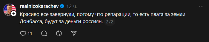 Этот момент я объясняю с самого начала этой эпопеи. Немножко уже надоедает. Потому что с годами пора бы уже начать понимать самим. Мир наступит в ту же секунду, как только наши враги сдадутся. Но они этого не делают. Из чего логически следует, что они не за мир. А за что-то другое. Репарации, если кто не знает, "возмещение материального ущерба, нанесённого странам-победителям". Т.е. они за их победу и наше поражение. Теперь совершенно открытым текстом. Не видят причин больше врать.