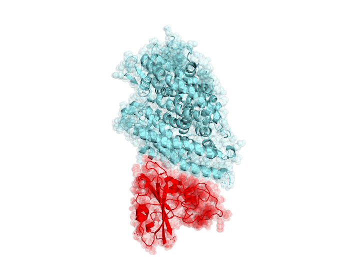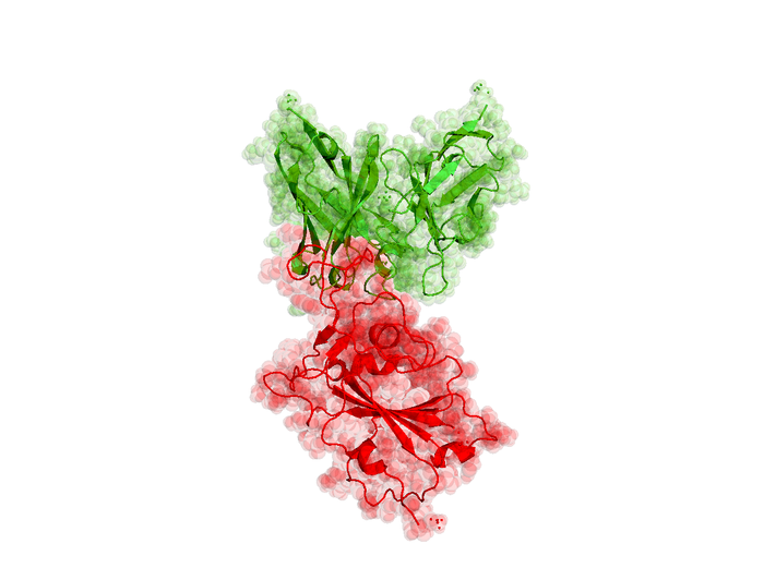 Домен RBD SARS-CoV-2 в комплексе с человеческим рецептором ACE2 (PDBID: 6vsb, 6acg) [http://dx.doi.org/10.1126/science.abb2507, http://dx.doi.org/10.1371/journal.ppat.1007236]