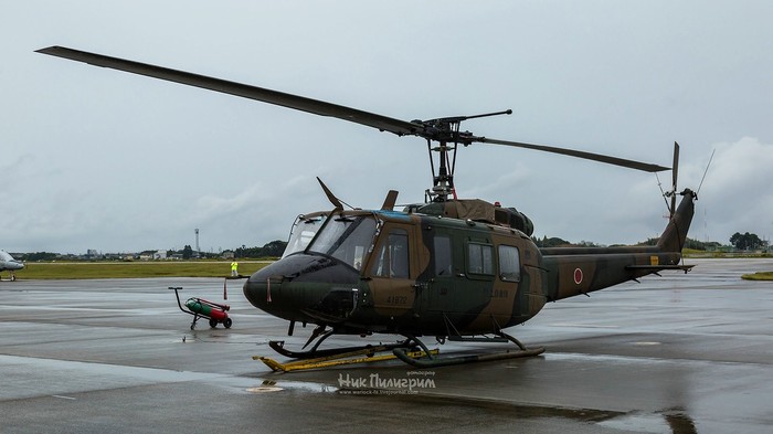 Открывал воздушную программу вертолет UH-60J. Это спецмодификация для ВВС Японии вертолета Sikorsky UH-60 Black Hawk, приспособленный для спасательных операций; оснащён спасательной лебёдкой с правого борта, внешними топливными баками, японской авиационной электронной техникой и метеорадиолокатором, бортовой ИК-системой FLIR для обнаружения целей.