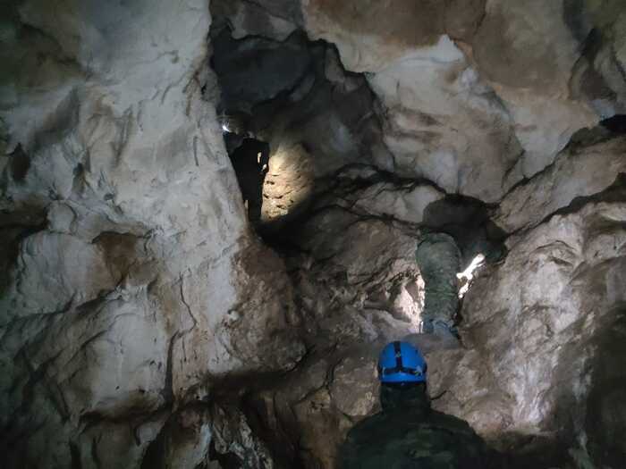 Точнее не совсем так, наш гид веселый, молодой и гибкий, как только мы спустились в четвертую пещеру, предложил поиграть в одну игру. Он предложил всем выключить фонари на касках на пару минут. Потом найти его в пещере. Пещера, точнее этот конкретны зал её, я вам сообщаю эта не большая комната, 10х10х5 метров и спрятаться в ней просто физически негде. Тем не менее через 2 минуты он пропал. Нет, он не вылез наружу через тот вход через который мы зашли, он перебрался в другой зал. Тот способ, которым он это сделал заслуживает отдельного внимания. Найти мы его смогли только когда он высунул голову из прохода а следующий хал…