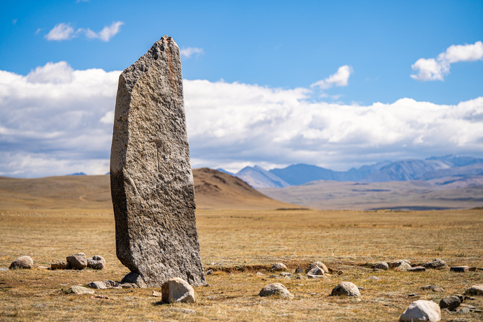 Этот камень стоит в центре цепочки небольших вертикально вкопанных камней. Они имеют такую же четырёхгранную форму и установлены попарно почти на равном расстоянии друг от друга по линии север-юг (длина ряда 150 м). Как правило, все эти камни узкими лицевыми сторонами ориентированы на восток. Впоследствии в результате частичных раскопок выяснилось, что все они были нижней частью обломанных, упавших, а затем задернованных оленных камней. По многочисленным обломкам предварительно удалось подсчитать число оленных камней. Их оказалось более тридцати.