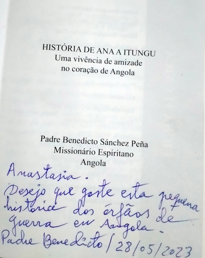 2 года назад на ежегодной выставке-ярмарке в честь Дня города мы познакомились с Отцом Бенедиктом Санчесом. Он из Испании, в Анголу приехал миссионером ещё в годы войны. На ярмарке он продавал свои книги, в которых рассказывает о своей службе, о прошлых событиях. Я купила книжку, ещё он подарил 2 фотокарточки. Книгу подписал на португальском: "Анастасия, желаю, чтобы тебе понравилась эта небольшая история о сиротах войны в Анголе. Отец Бенедикт. 28.05.23". Позже я поискала информацию о нем в интернете. В 1986 году его направили с миссией в Ндалатанду, он заменил другого священника, который погиб, наступив на противопехотную мину по дороге в деревню. Отец Бенедикт начал с того, что приютил и заботился о детях-сиротах, чьи родители погибли в войне. Их было примерно 700. Ему помогали другие миссионеры и просто неравнодушные люди. 6 лет спустя он вернулся в Испанию, а в 2000 году вновь отправился в Анголу, в этот раз в провинцию Маланже. В тот период он много работал над тем, чтобы примирить народ после затяжной гражданской войны, посещал казармы, организовывал встречи с военными и полицией. В 2012 он вернулся в Испанию, чтобы работать в наркологическом центре, куда приходили паломники. Позже он снова захотел вернуться в Анголу, настоятели были против, но он очень настаивал, в конце концов ему разрешили, и в 2017 он третий раз вернулся в Анголу.