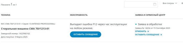 Ну и собственно началась эксплуатация стиральный машины, до 12 сентября 2025 года проблем не было никаких, функционал, эргономика, шумность и качество работы, все устраивало. Однако в этот злополучный день на экране впервые высветилась ошибка F12. Ошибка стала периодически появляться примерно через 1 час после начала стирки, ее появление не зависит от режима работы в момент появления.