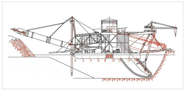 Немного матчасти. Драга это целая плавучая фабрика, набитая сложнейшим оборудованием под завязку. Работает этот агрегат прямо на воде, а его главная фишка - многоковшовая цепь, которая гребет породу со дна, как голодный экскаватор. Поднятый грунт тут же моют, обогащают, забирают все ценное, а пустую породу выплевывают обратно в реку или на берег. Установленное на борту оборудование позволяет делать полный цикл работ: от добычи руды до сброса отходов, не сходя с места.