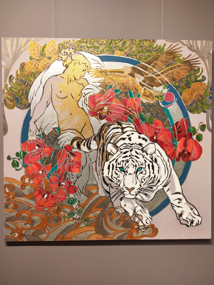 Красоту и грацию белого тигра, священного животного у многих народов Востока, передаёт художница в картине "Прыжок".