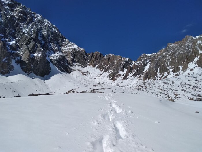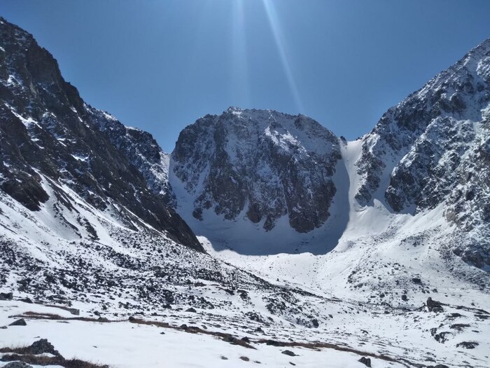 Хотел заходить в долину КараОюка по Шавлинскому хребту через перевалы Козий, Широкий, Чёрный, Межозерный, Цирковой. Но валил снег, не хотелось там встрять - все цирки перевалов северные. Сложность даже не в самих перевалах, а в подходах к ним по курумнику под снегом - слишком скользко. Их заменил на перевал Куранду.
