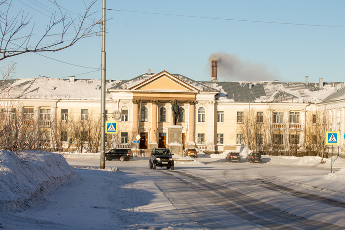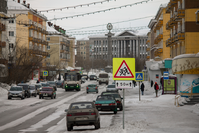 Центральная улица Воркуты, улица Ленина, вроде бы ещё живая, здесь куча всяких разных заведений, ездят машины, ходят люди.