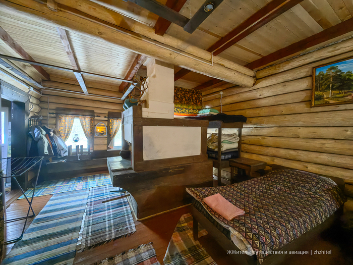 Обстановка в доме простая, но уютная. Две просторных комнаты, в каждой есть печь, но также смонтировано отопление от котла. Деревянные кровати, можно поспать на полатях. В доме есть комфортный санузел, поэтому на мороз бегать не нужно. Заселяться лучше семьей или компанией.