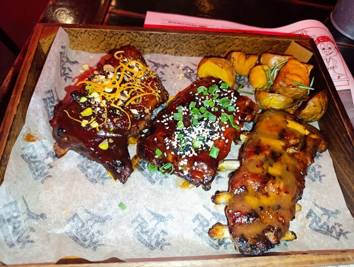 Набор рёбер BBQ (медовый, терияки, кисло-сладкий). Как же легко отходит мясо от кости! Оно даже не нуждается в соусах и посыпках, это уже блажь. Мясо буквально тает во рту. Теперь я понимаю, почему в это заведение сложно пробиться. Я осилила только один кусок рёбер, бургер не пускал остальные яства.