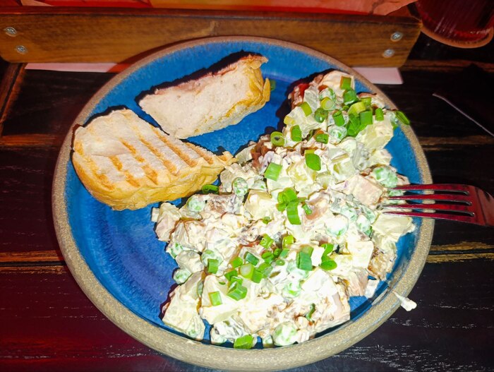 Картофельный салат с рёберным мясом. Фото вышло слишком ярким от вспышки, а в тёмном углу иначе блюд будет не видно, поэтому расскажу словами: отварная картошка, мясо рёберное, молодой отваренный горошек, солёные огурцы и заправка из домашнего майонеза. Салат можно назвать интересной интерпретацией оливье. Всё к месту, сочетается, я бы даже назвала его базовым блюдом. Я осталась довольна.