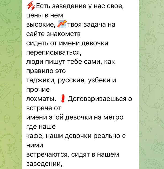 Парням предлагают сидеть от имени девочек в соцсетях и подогревать потенциальных жертв к встрече в ресторане.