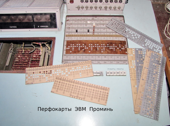 Если программа использовалась многократно, ее можно было набить на перфокарты (медная фольга с бумажным покрытием, см. фото). Результаты работы программы выводились на печатающее устройство (типа электрифицированной пиш. машинки).