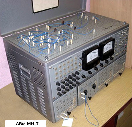 Помимо Проминь мы делали лабораторки на аналоговой машине МН-7. Сейчас класс АВМ практически вымер, а в те времена их считали конкурентами ЦВМ для решения обыкновенных дифференциальных уравнений (ОДУ) и их систем, а также диф. уравнений в частных производных.