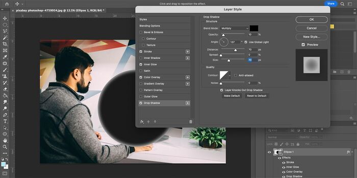 Наконец, выберите Drop Shadow в левом меню Layer Style. Установите режим наложения Multiply с черным цветом. Установите Opacity на 10% и измените угол примерно на 137 градусов. Установите Distance на 70 пикселей, Spread на 0%, Size на 70 пикселей и Noise на 0%. Нажмите OK .