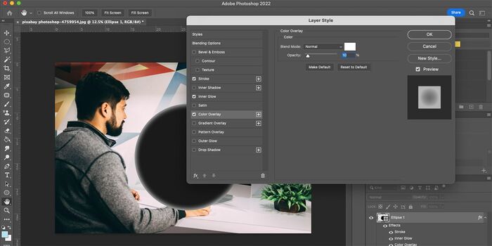 В окне Layer Style выберите Color Overlay и установите Blend Mode на Normal , а цвет — на белый. Установите Opacity на 10%.